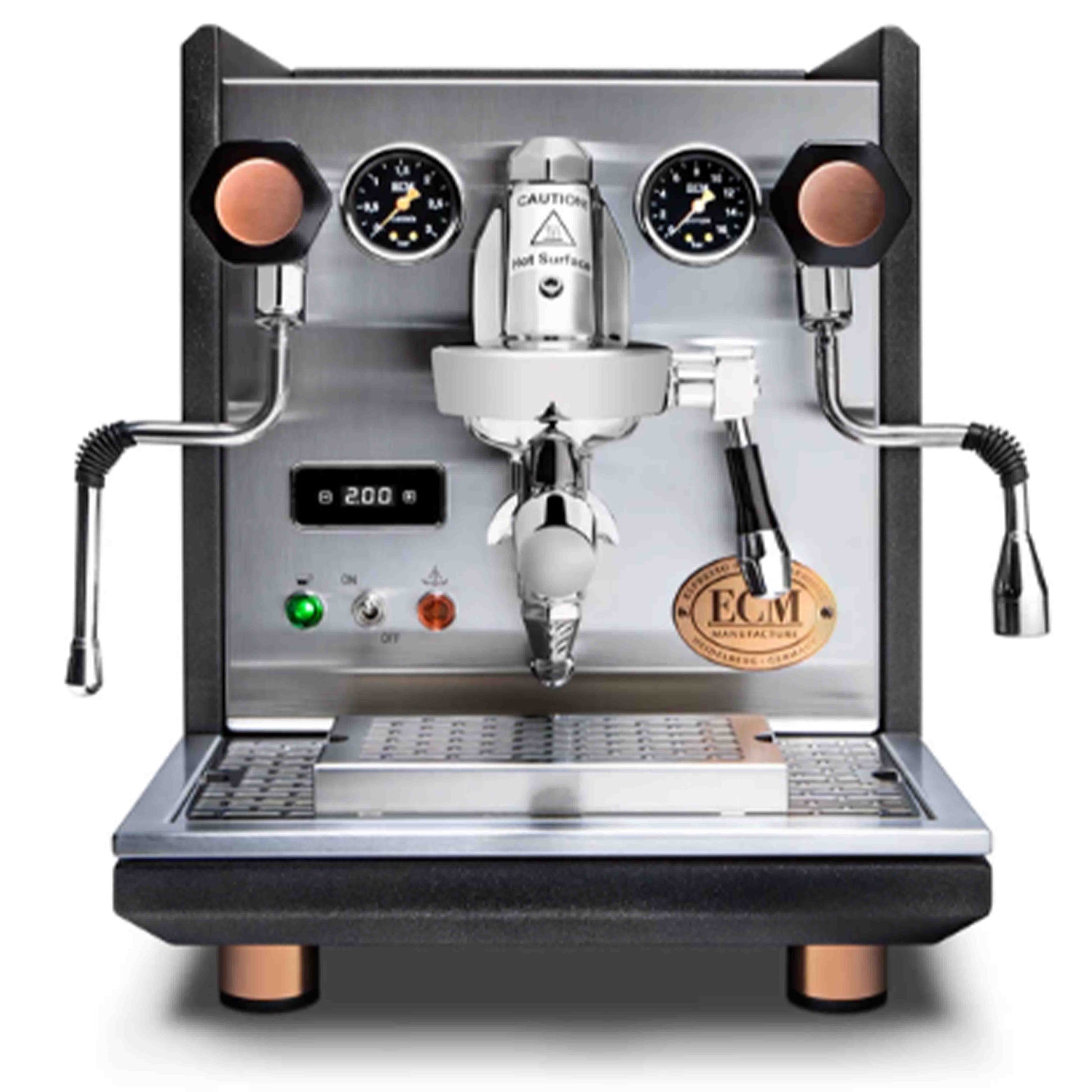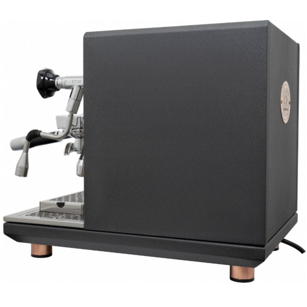 تتميز آلة سينكرونيكا هيريتيج إيديشن بتصميمها الأنيق، حتى بالمقارنة مع الموديلات الأخرى في السلسلة. يمتزج هيكلها ذو اللون الفحمي الفريد ببراعة مع لمسات النحاس، مما يمنحها مظهرًا تاريخيًا فاخرًا يُضفي لمسةً مميزة على ركن قهوتك المنزلية. كما أنها مزودة ببرنامج التسخين السريع ECM، الذي يُسخّن الغلاية إلى درجة حرارة التخمير في 10 دقائق فقط - أسرع من آلات E61 القياسية. (يجب شطف الخرطوم قبل التخمير وفقًا للتعليمات).